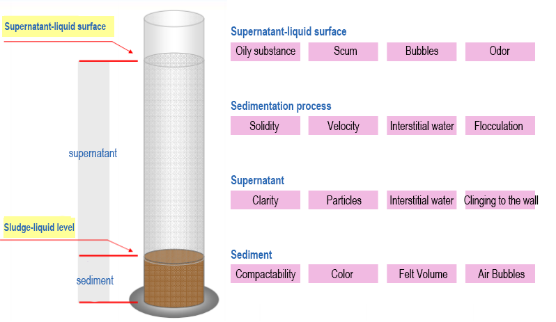 | 間質水 | 明瞭さ of water between scattered particles. | 1. 過剰なエアレーション (大きな粒子の間に小さな粒子がまだ水中に見える)。活性汚泥(清澄な間質水)の熟成、3.過負荷(間質水の濁り) 4. 4. 汚泥中毒(濁った間質水)。 |
