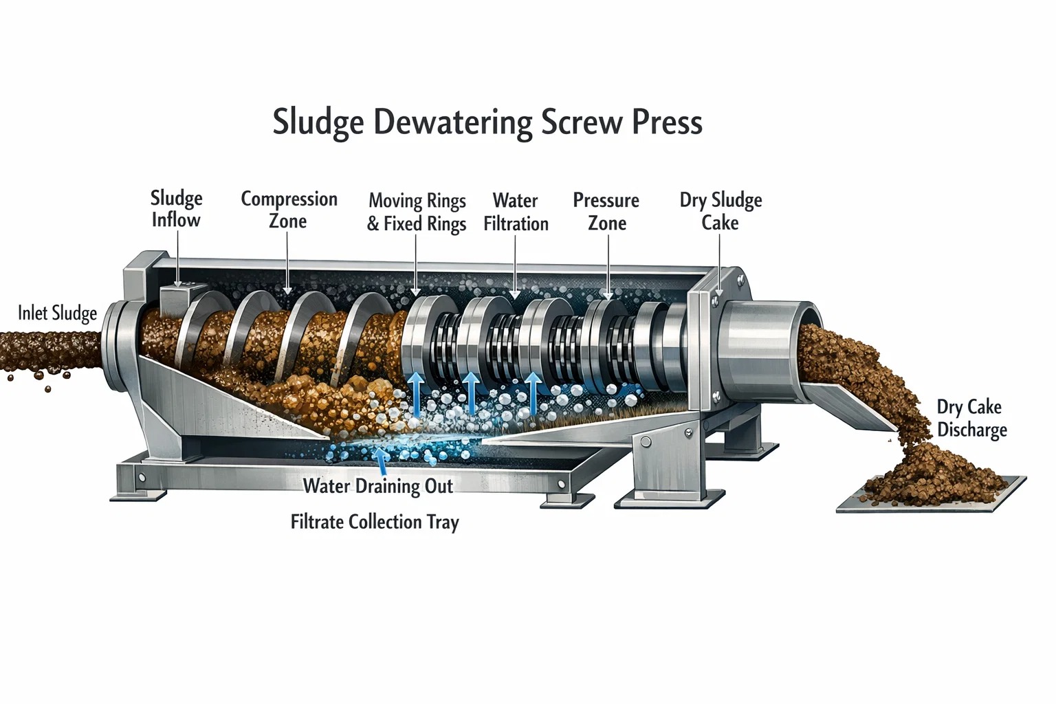 - 統合: A 汚泥脱水スクリュープレス です the perfect partner for MBR. It handles the high-concentration waste sludge efficiently, turning it into a dry “cake” for easy disposal. Its low-speed operation and self-cleaning mechanism mean it can handle the greasy, chemical-heavy sludge typical of these industries without clogging.