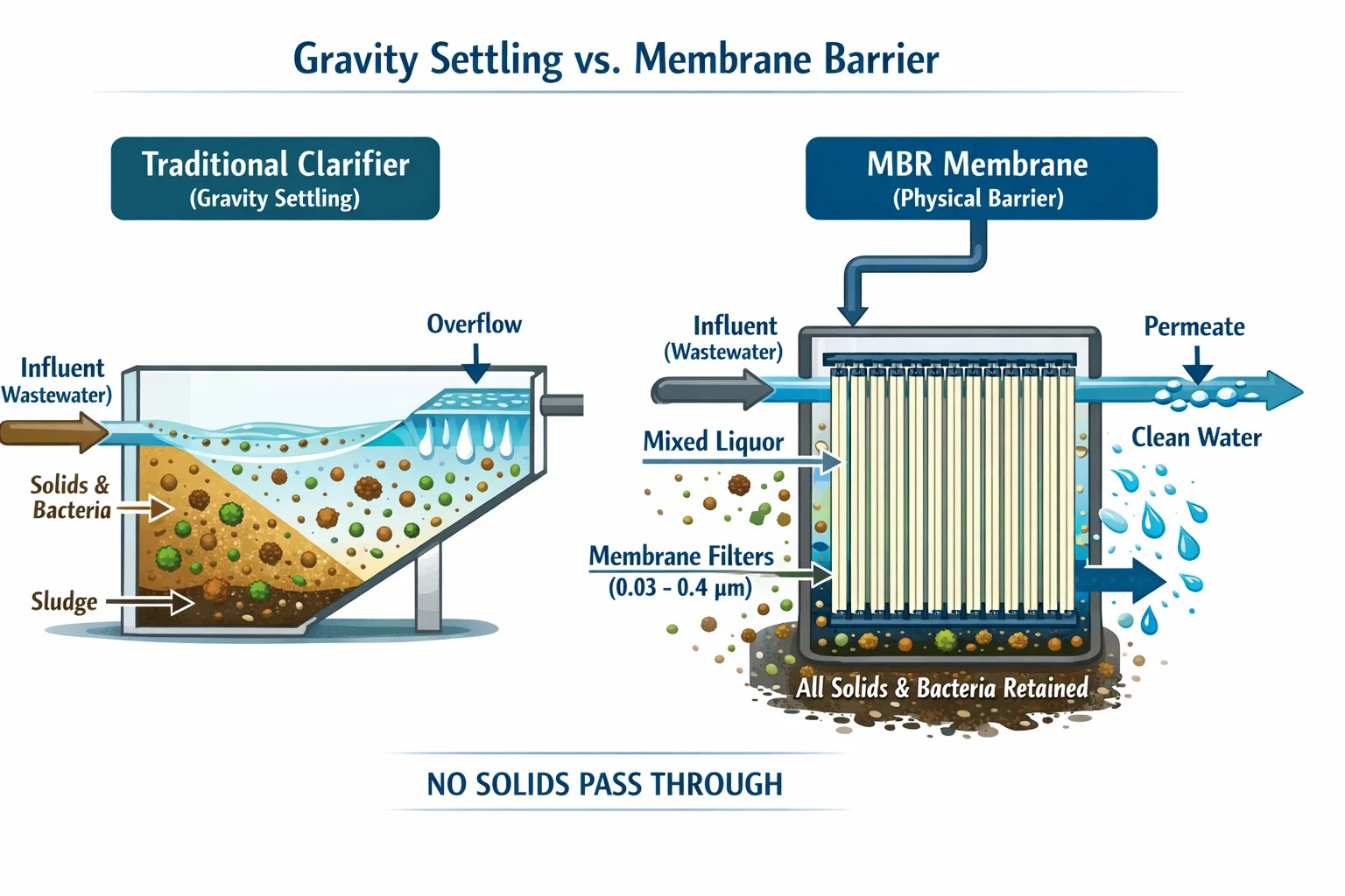 従来のプラントでは、粒子が沈む速さによって制限されます。 MBR では、 物理的な膜バリア (通常は 0.03 ~ 0.4 μm)。